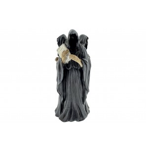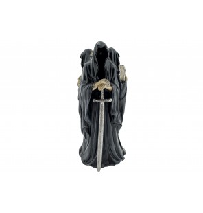 Statue de trois Grim Reapers tenant un crâne, un livre et une épée. Un bougeoir gothique aux finitions soignées pour les amateurs de fantastique.