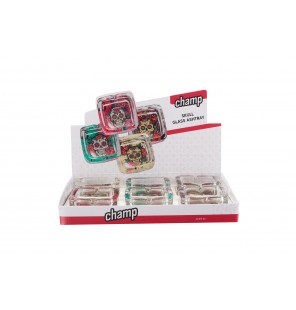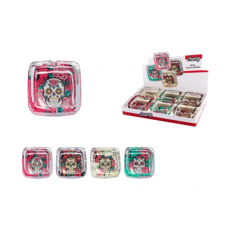 Présentoir de 6 cendriers en verre tête de mort assortis.